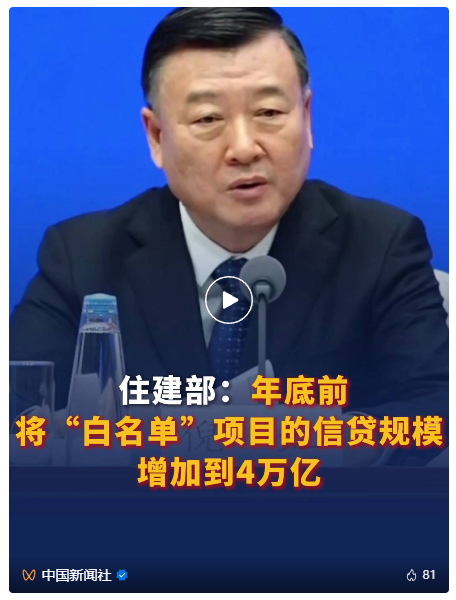 二是年底前,将“白名单”项目的信贷规模增加到4万亿元。城市房地产融资协调机制要将所有房地产合格项目都纳入“白名单”,应进尽进、应贷尽贷,满足项目合理融资需求。