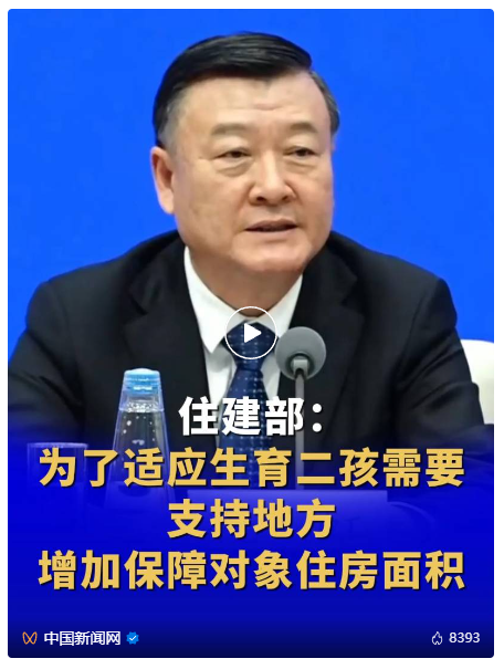 住建部部长倪虹表示,为了适应生育二孩的需要,支持地方结合实际,增加保障对象住房面积,各城市政府结合当地实际,优化完善房地产政策同时,一定要加大保障力度,兜牢住房保障底线。到今年年底,计划让450万青年人、新市民能够住进保障性住房。